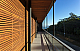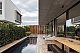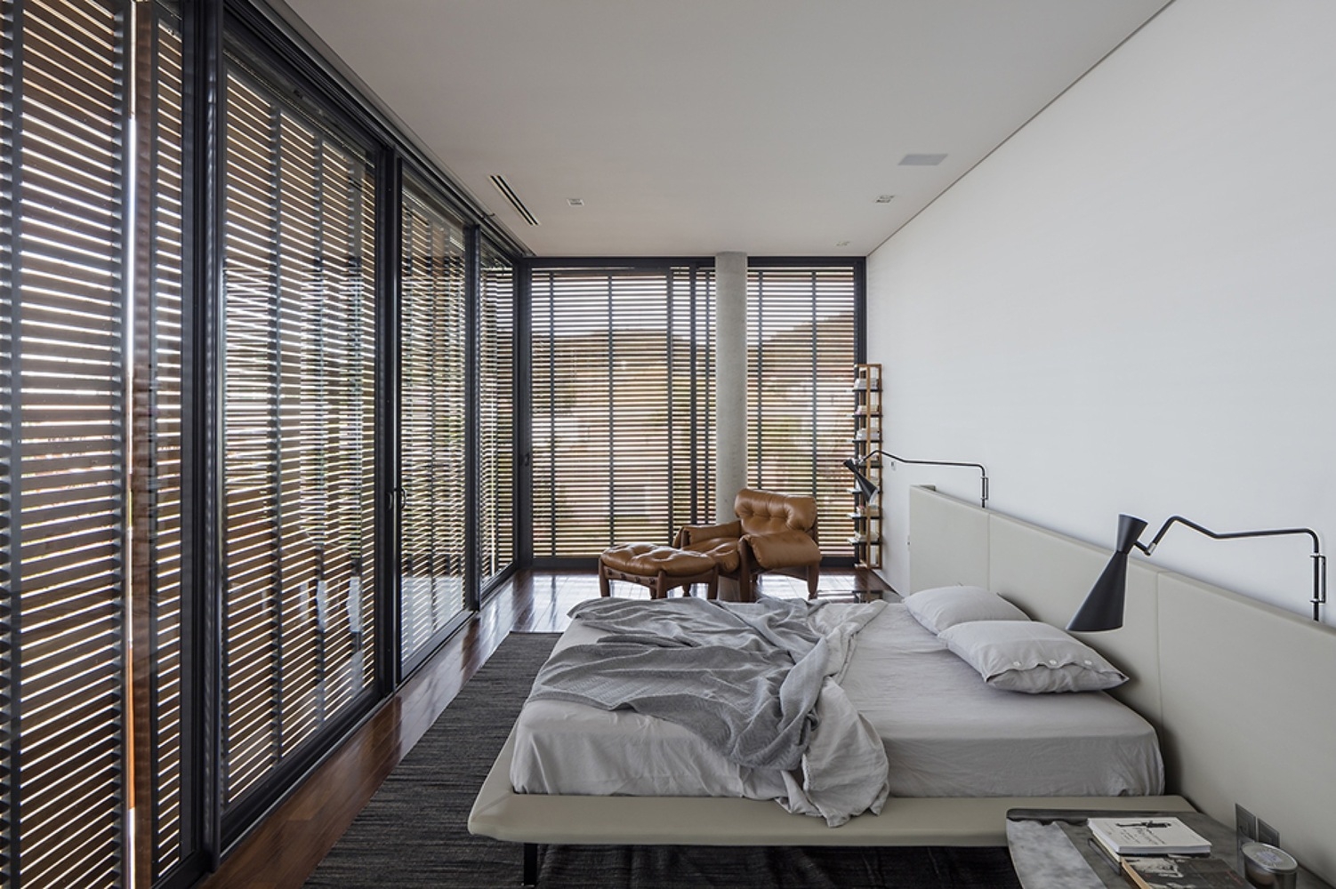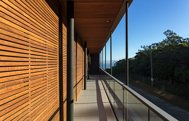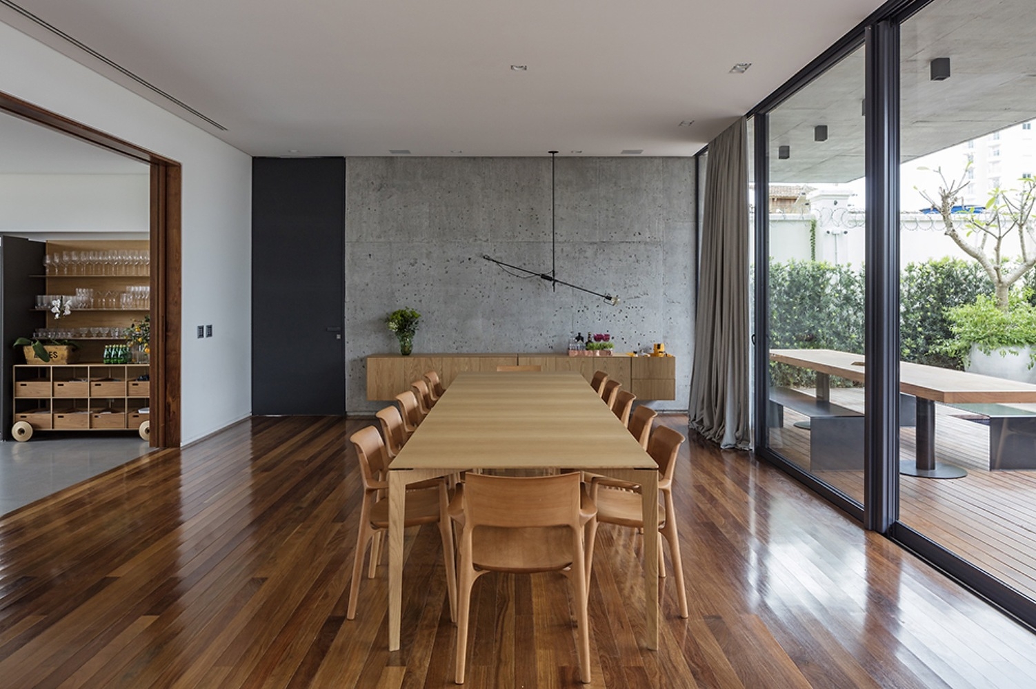 A estrutura de laje nervurada e pilares de concreto aparente possibilitou a criação de grandes vãos, separando a estrutura da fachada de vidro. A paleta de materiais, que combina madeira, concreto aparente, vidro incolor e alumínio cinza escuro, é uma assinatura do escritório, conferindo aos projetos uma estética minimalista e de forte impacto visual.