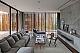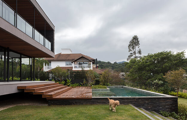 Pavimento inferior: Abriga as áreas sociais, como a sala de estar e o jantar, que se estendem em direção à paisagem. A piscina, também no térreo, foi estrategicamente posicionada para se integrar ao living e à área de jantar, criando um ambiente íntimo e relaxante.