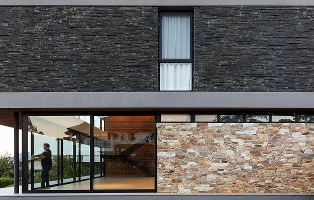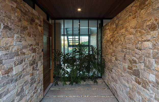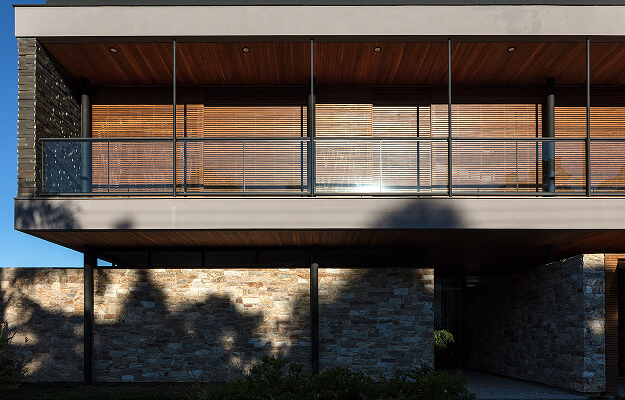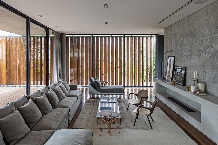 A arquitetura da casa se destaca pela sua abordagem de implantação, com a garagem semienterrada formando uma fachada de linhas horizontais. O pavimento térreo e o superior são elevados, equipados com brises verticais móveis e brises de madeira Cumaru, respectivamente. Essa solução não só controla a luz e a ventilação, mas também contribui para a estética da residência.