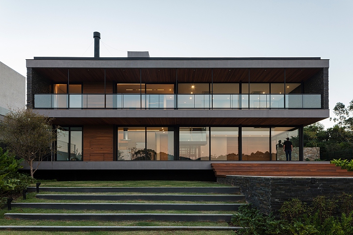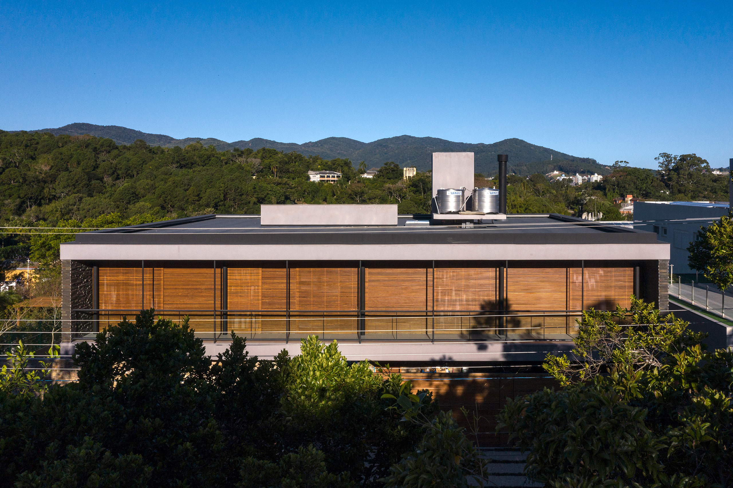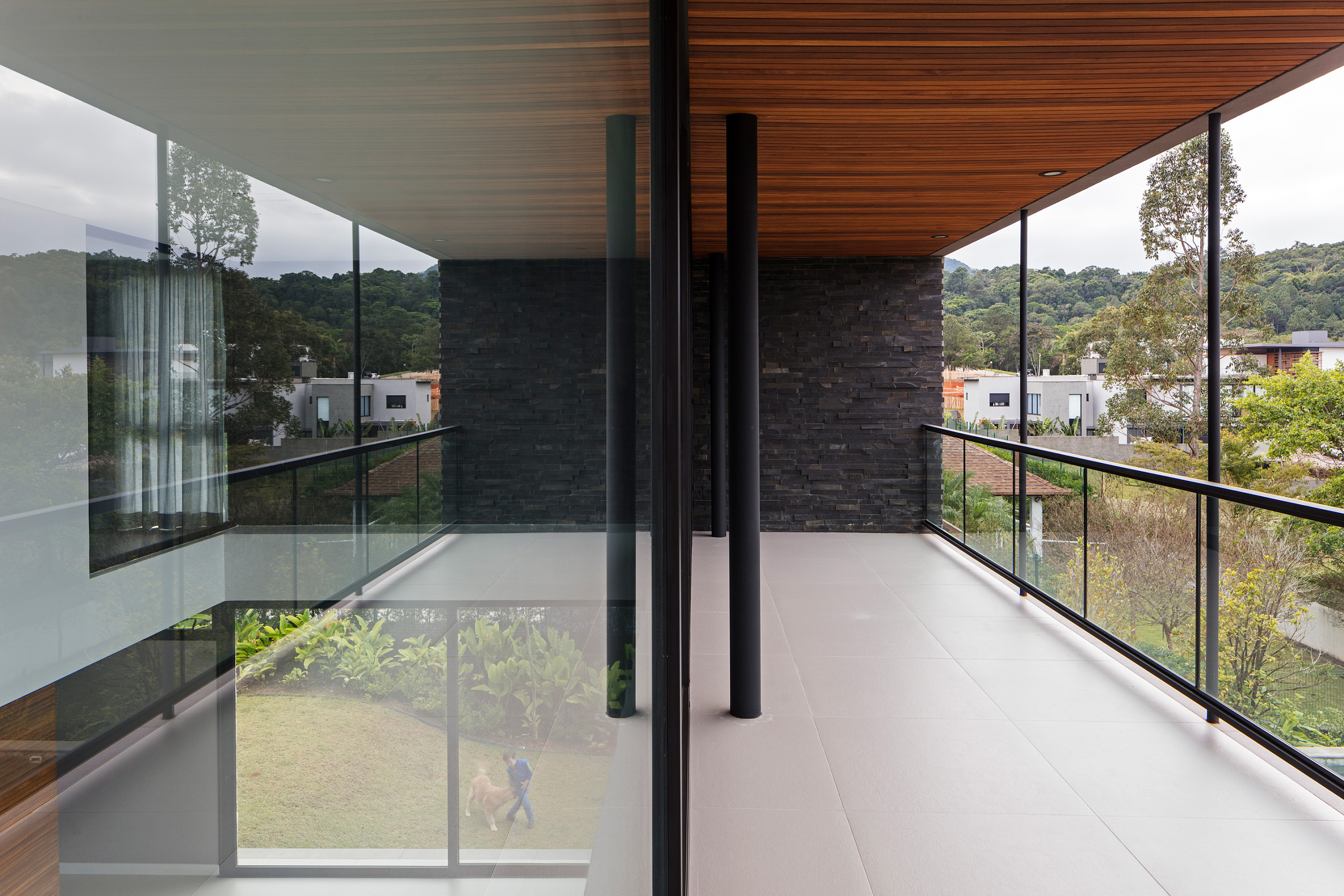 No nível superior estão localizados os quatro dormitórios, rouparia e escritório que podem também ser acessados por elevador além da escada metálica com solução de degraus em madeira. As varandas superiores permitem a proteção solar adequada e abertura para as vista da região. A suíte principal possui visuais para ambas fachadas por meio de uma abertura para o pé direito duplo da área de living.