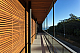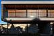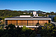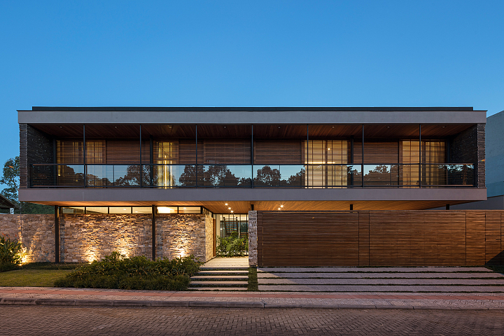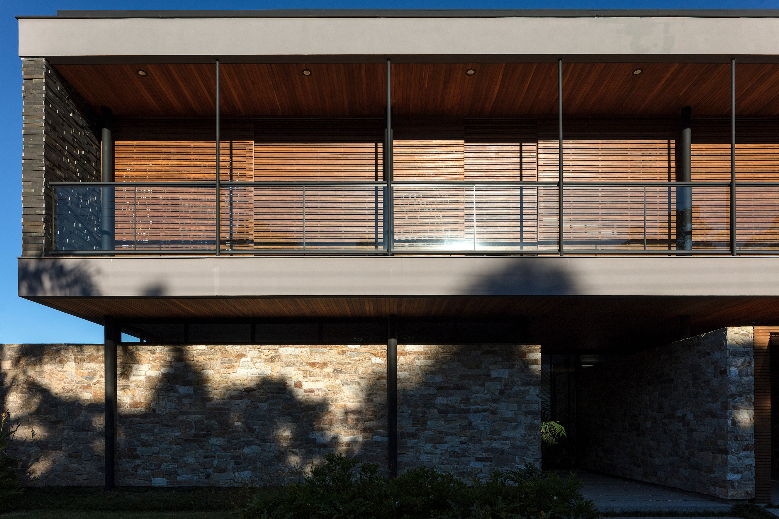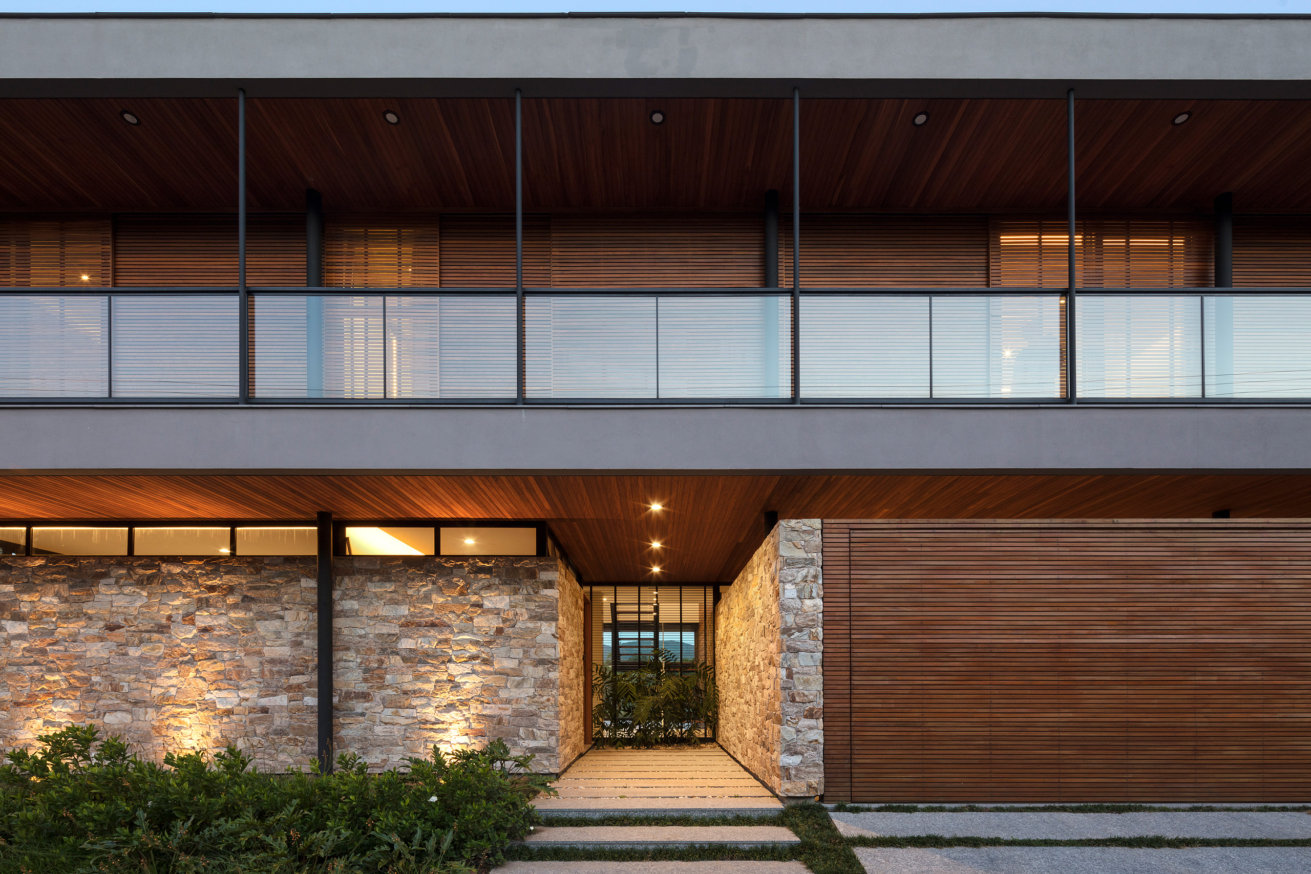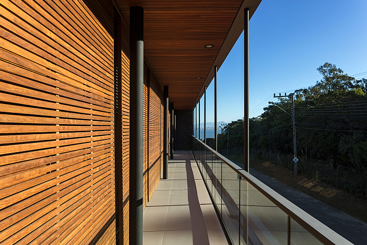 Os brises de madeira conformam materialidade da obra a juntamente com os muros em pedra madeira e basalto.