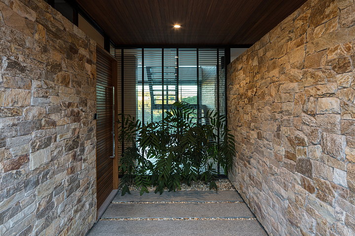 O projeto se organiza em três níveis com áreas técnicas no subsolo, living no pavimento térreo e dormitórios no nível superior. No nível térreo foi localizado as áreas de estar, jantar, cozinha, garagem, serviços, uma pequena academia e sala de tv integrada à sala principal por painel deslizante em madeira.